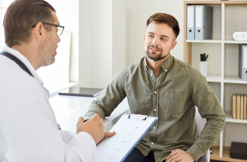Ein Mann sitzt lächelnd vor seinem Arzt, der ein Klemmbrett in der Hand hält. Er ist für eine Gesundschreibung in der Praxis.
